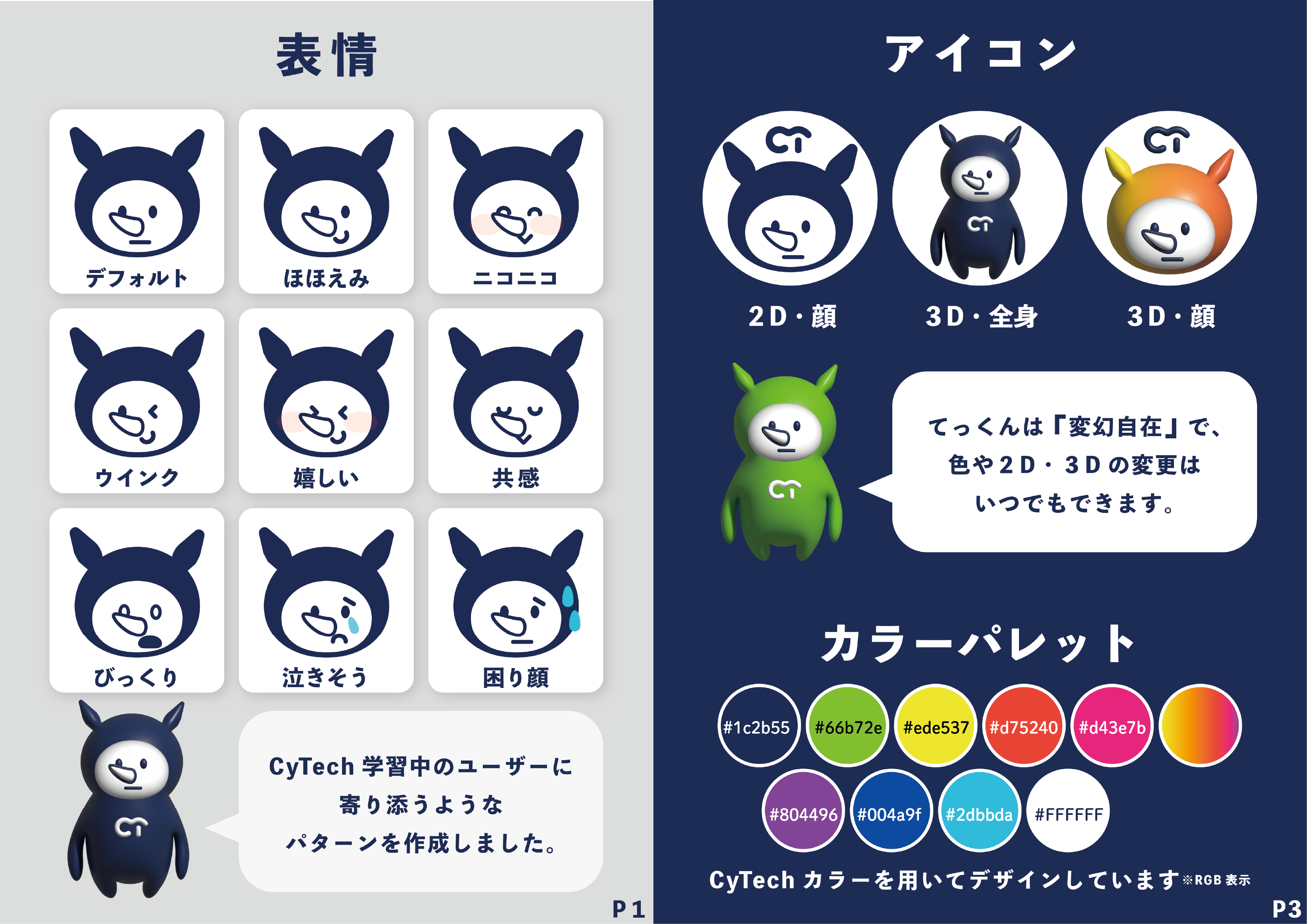 情報量を増やすと幼く見え、減らすと個性が弱くなる点が難しかったため、特徴は“角/耳/輪郭”に集約し、配色は見やすさ優先で整理しました。