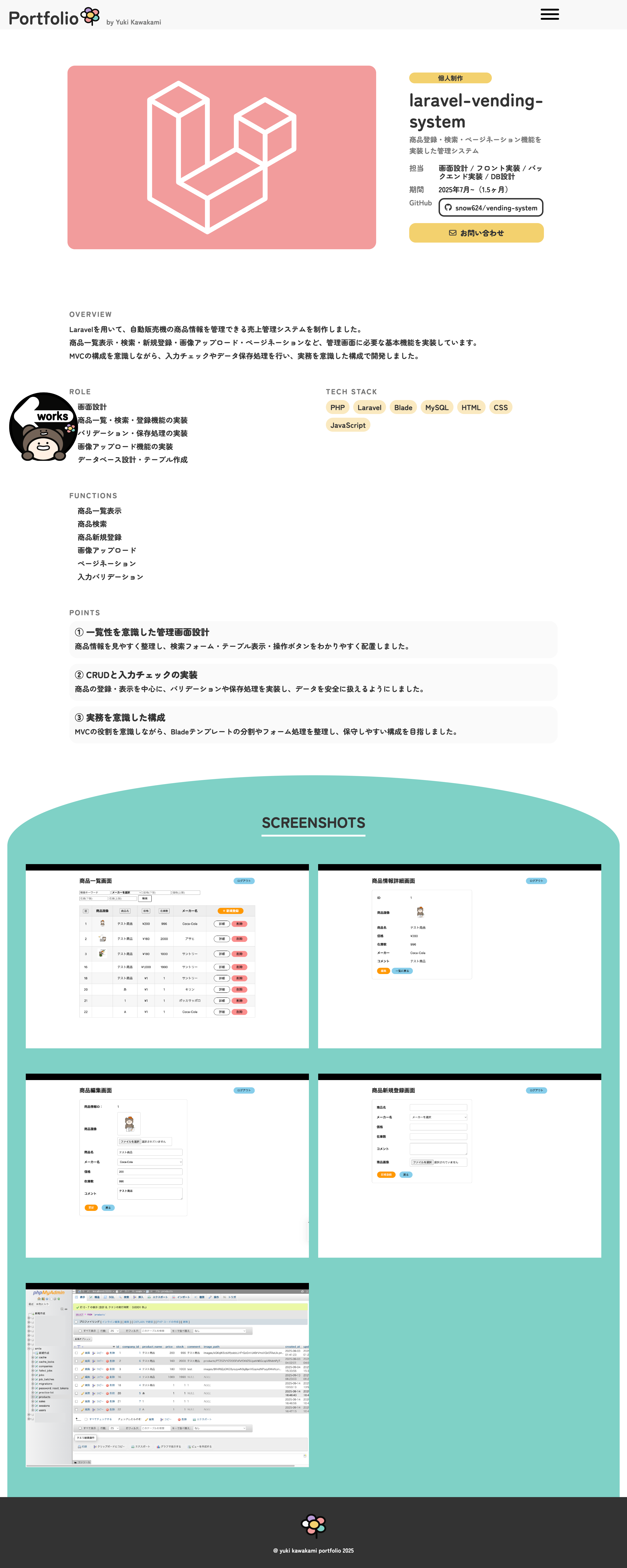 制作実績を短時間で理解できるように、作品一覧・詳細ページの構成を整理しました。 視線の流れを意識し、情報の優先順位を考えたレイアウト設計を行っています。
